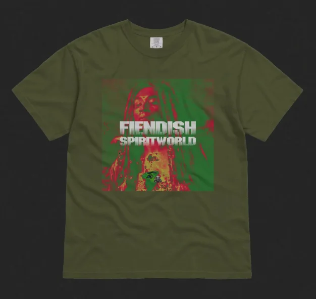 Featuring the artwork for new FIENDISH single 'SPIRITWORLD, on a comfy Khaki T-Shirt.